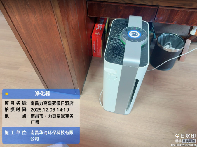 项目名称:南昌力高皇冠假日酒店安装空气净化器施工时间:2025年12月6日